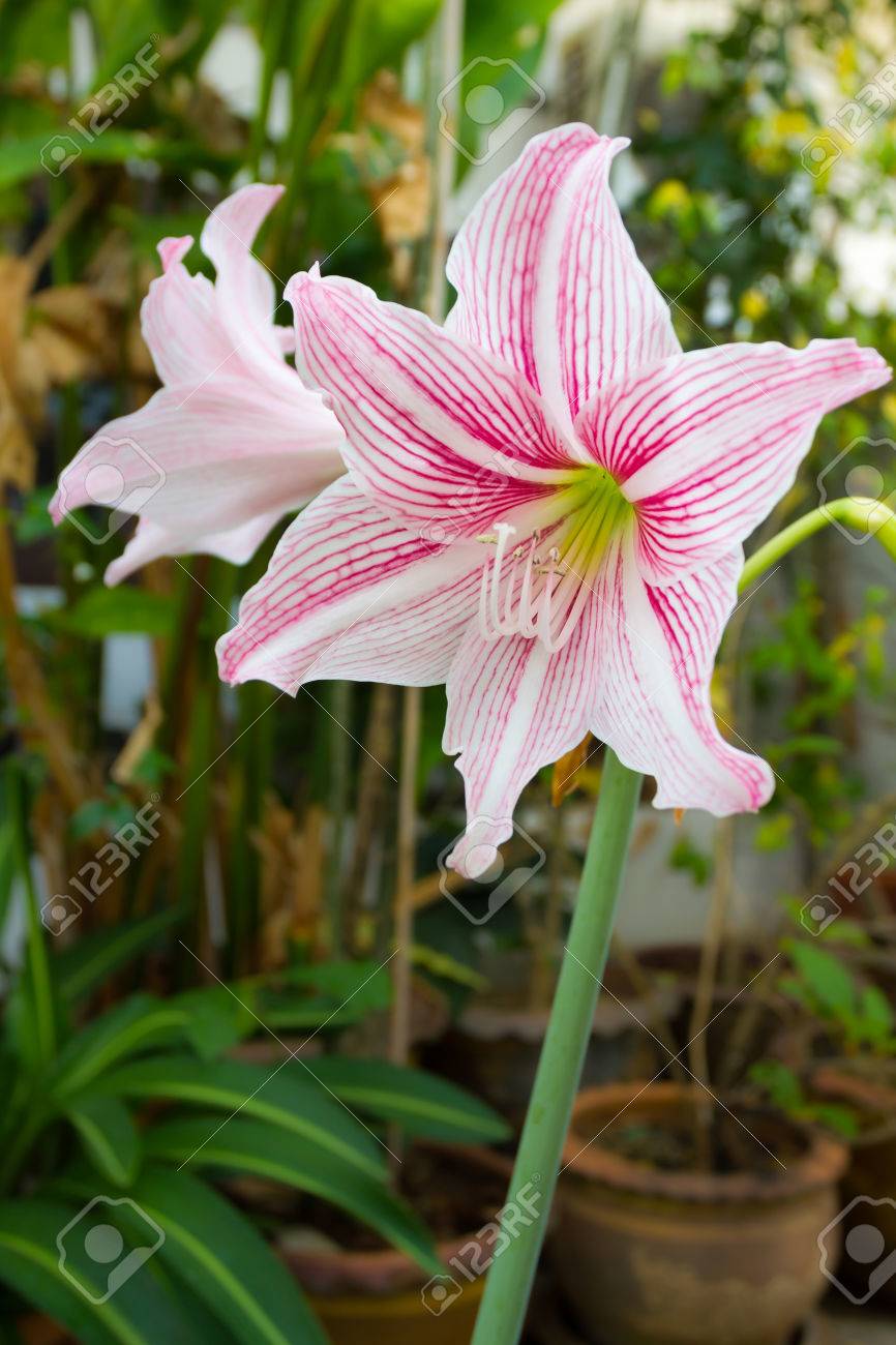 近くにピンクと白のアマリリスの花のアップ の写真素材 画像素材 Image
